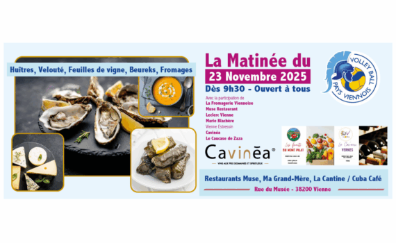 Le dimanche 23 novembre, le VBPV organise sa matinée huîtres !Cet événement aura lieu à partir de 9h30, rue du musée à Vienne.Vous pourrez y déguster des huîtres, le velouté du chef Philippe Deval, des feuilles de vigne et beureks du Caucase de Zaza, ainsi que des plateaux de fromages de la Fromagerie Viennoise… et…