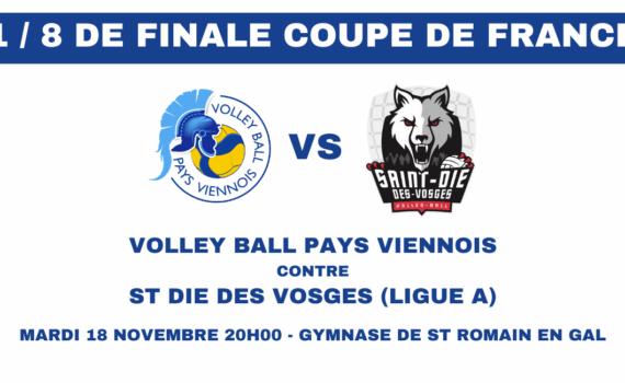 1/8 DE FINALE DE COUPE DE FRANCE PRO Mardi 18 novembre à 20h Gymnase de Saint-Romain-en-Gal Pour le 1/8 de finale de la Coupe de France Pro, notre équipe affronte Saint-Dié-des-Vosges, formation évoluant Ligue A. Un choc exceptionnel à ne pas manquer ! Accès au match uniquement sur pré réservation. Tous les spectateurs (partenaires, licenciés,…