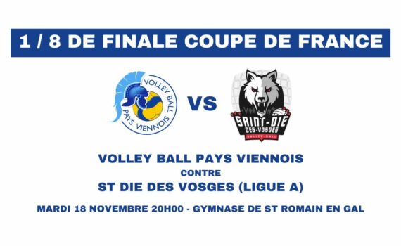 1/8 DE FINALE DE COUPE DE FRANCE PRO Mardi 18 novembre à 20h Gymnase de Saint-Romain-en-Gal Pour le 1/8 de finale de la Coupe de France Pro, notre équipe affronte Saint-Dié-des-Vosges, formation évoluant Ligue A. Accès au match uniquement sur pré-réservation. Tous les spectateurs (partenaires, licenciés, abonnés, -18 ans, supporters) doivent impérativement réserver leur place…
